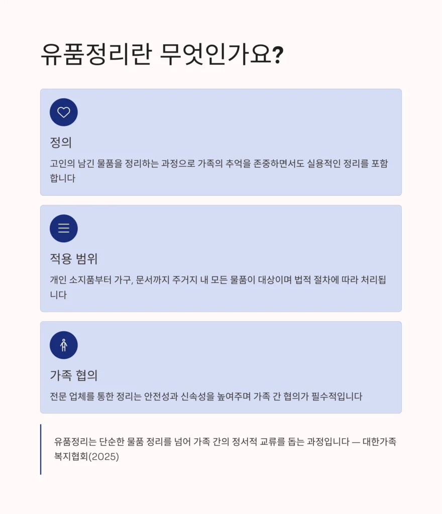 유품정리는 단순한 물품 정리를 넘어 가족 간의 정서적 교류를 돕는 과정입니다 — 대한가족복지협회(2025)