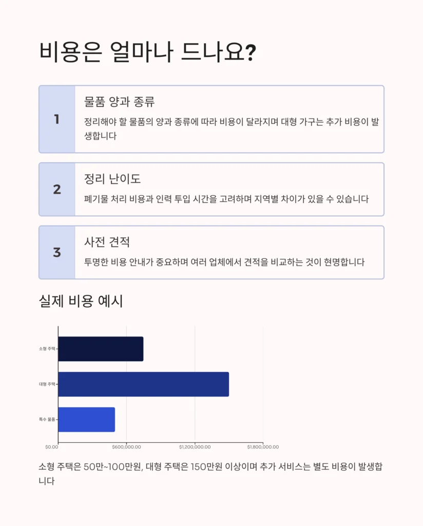 비용은 물품 양, 종류, 정리 난이도, 폐기물 처리 비용, 인력 투입 시간 등을 고려하여 산정됩니다. 지역별 차이도 반영되어 견적이 달라질 수 있습니다.