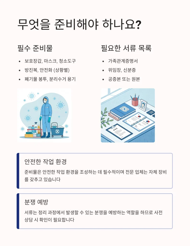 보호장갑, 마스크, 청소도구 등이 기본 준비물이며, 가족관계증명서, 위임장, 신분증 등의 서류가 필요합니다. 법적 절차에 따라 추가 서류가 요구될 수 있습니다.