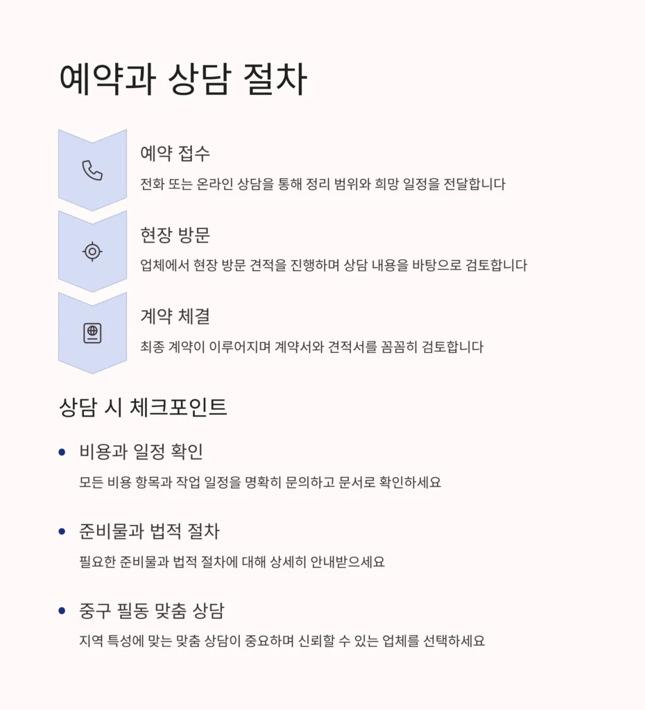 전화 또는 온라인 상담을 통해 예약하며, 정리 범위와 일정을 상세히 전달합니다. 상담 후 현장 견적과 계약이 이루어지며, 변경 시 사전 통보가 필요합니다.