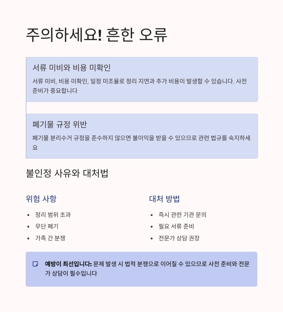 서류 미비, 비용 미확인, 일정 미조율 등이 주요 오류입니다. 사전 준비와 법규 숙지가 중요하며, 전문가 상담을 통해 문제를 예방할 수 있습니다.